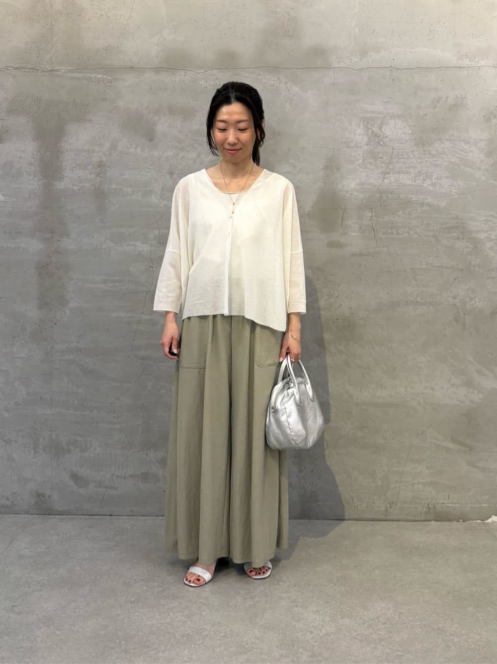 【カーディガン】Fサイズ シアー素材が軽やかで見た目も涼しげなカーディガン。 鹿子編みで通気性良く夏場に向けても重宝しそうです。 Vネックなので顔まわりすっきり見せてくれ 前後差があるのでワイドボトムやスカートと合わせても軽やかな印象に。 【パンツ】1サイズ 裾に向かって広がるデザインですが 落ち感があるので綺麗なシルエットに。 生地は厚みがなく さらさらっとしたストレッチジャージー素材なので穿き心地も快適です。 大きめのポケットがアクセントに。 【バッグ】 間口が広いので物の出し入れもしやすいバッグ。 260gと軽量なので疲れ知らずです。
