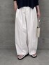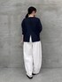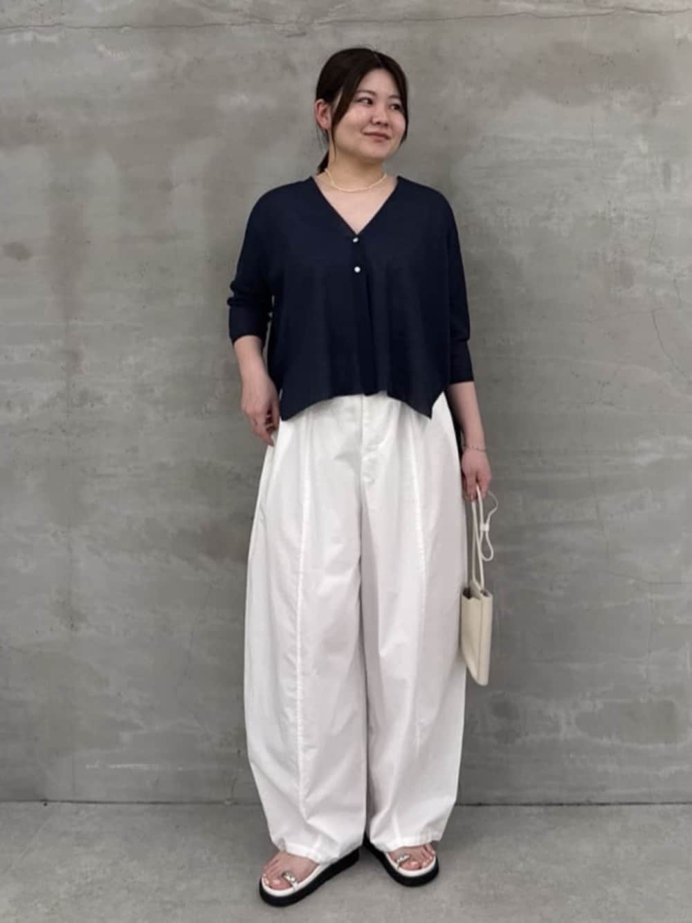 【カーディガン】着用サイズ:F ビアズリーのロングセラー、サラッとカーディガンの新素材です。 着回しのきくシンプルなデザインと、レイヤードを楽しめる程よい透け感が魅力です◎ 顔周りがすっきりと見えるVネックで、ボタンを閉めてプルオーバーとしても着用していただけます。 コンパクトな着丈でワイドパンツやボリュームスカートなどのボトムスともバランスが取りやすい一枚です。 165cmの私は、Fサイズ着用でお尻にかかる丈感です。 【パンツ】着用サイズ:2 丸みのある立体的なシルエットが特徴のコットンバレルパンツ。 ウエストはゴム仕様なので窮屈感なく着用していただけます◎ フロントはジップデザインにすることでトップスをインした際もすっきりと見え、きちんと感も兼ね備えています。 シンプルなトップスを合わせるだけで、スタイリングが決まるカジュアルパンツです。 165cmで2サイズ着用で、足首しっかり隠れる丈感です。