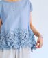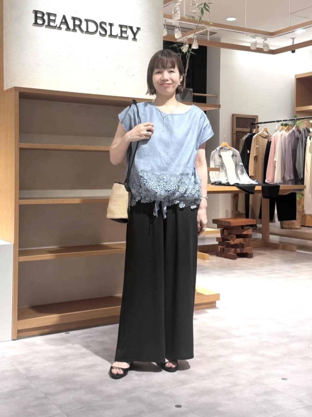【ブラウス】Fサイズ リネン素材なので、涼しく着られて汗もすぐ乾き、着こむごとに肌馴染みが良くなります。 フレンチ袖で、ノースリーブより肩が隠れて安心です。 ブルーは、裾にほどこされたレースが生地と同色で、落ち着いたくすみカラーなので、肌馴染みが良いですよ。 【パンツ】1サイズ着用 近日ご予約スタート! 薄くてとてもソフトなジョーゼット素材。 サラサラで真夏も着れます。 しわにならないので、ご旅行にもおすすめです。