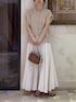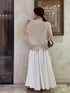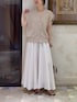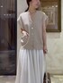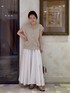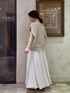 【ニット】Fサイズ 着心地の良い滑らかな肌触りのニットベスト。 ボタンを開けて、羽織りのようにも着用可能◎ ツヤ消しのゴールドボタンがアクセサリなしでも上品な印象に見せてくれます。 後ろの裾にはスリットが入っていて、さりげないワンポイントに。 【スカート】Fサイズ 軽やかでほんのりシアー感のあるフレアスカート。 リネン混で涼しげな印象に。 たっぷりと贅沢に生地を使っているので、 歩くたびに揺れるシルエットが印象的。 ウエストは総ゴムでストレスフリーなのも嬉しいポイント。