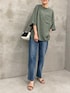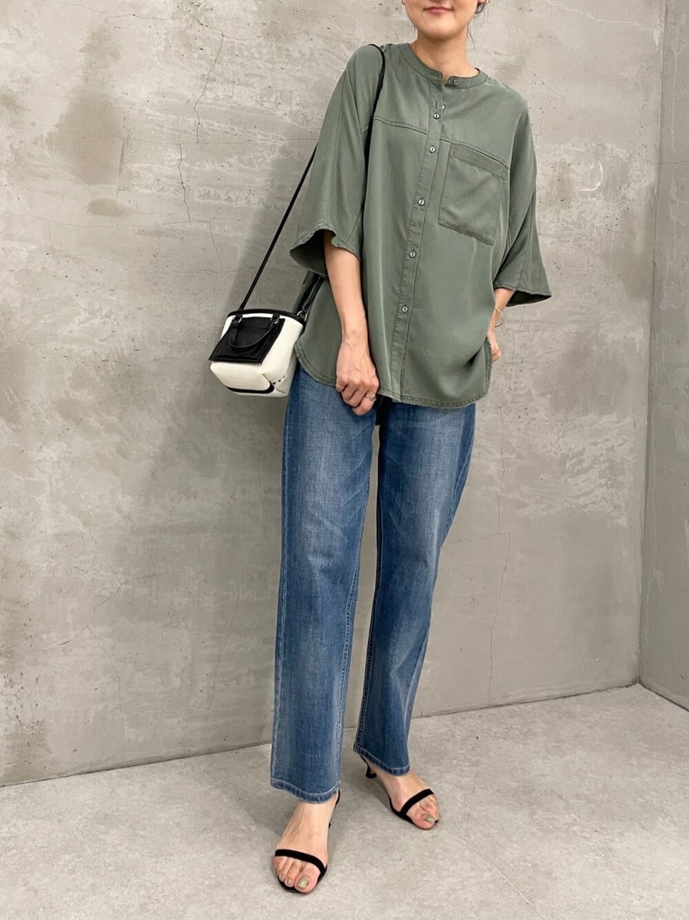 【blouse】Fサイズ 生地にとろんとした落ち感があるブラウス。 ゆったりシルエットですがハリ感がないので着痩せして見えます。 肘と腰回りカバーできる丈。 裾のフリンジデザインがポイントです。 洗濯 :手洗い可 伸縮性:なし 【denim】Fサイズ 店頭にも再入荷しているストレートデニム。 ストレッチがきいていて、生地が柔らかいので穿いて感動される方が多いです。 洗濯 :手洗い可 伸縮性:あり