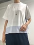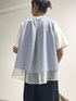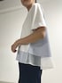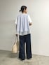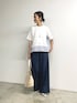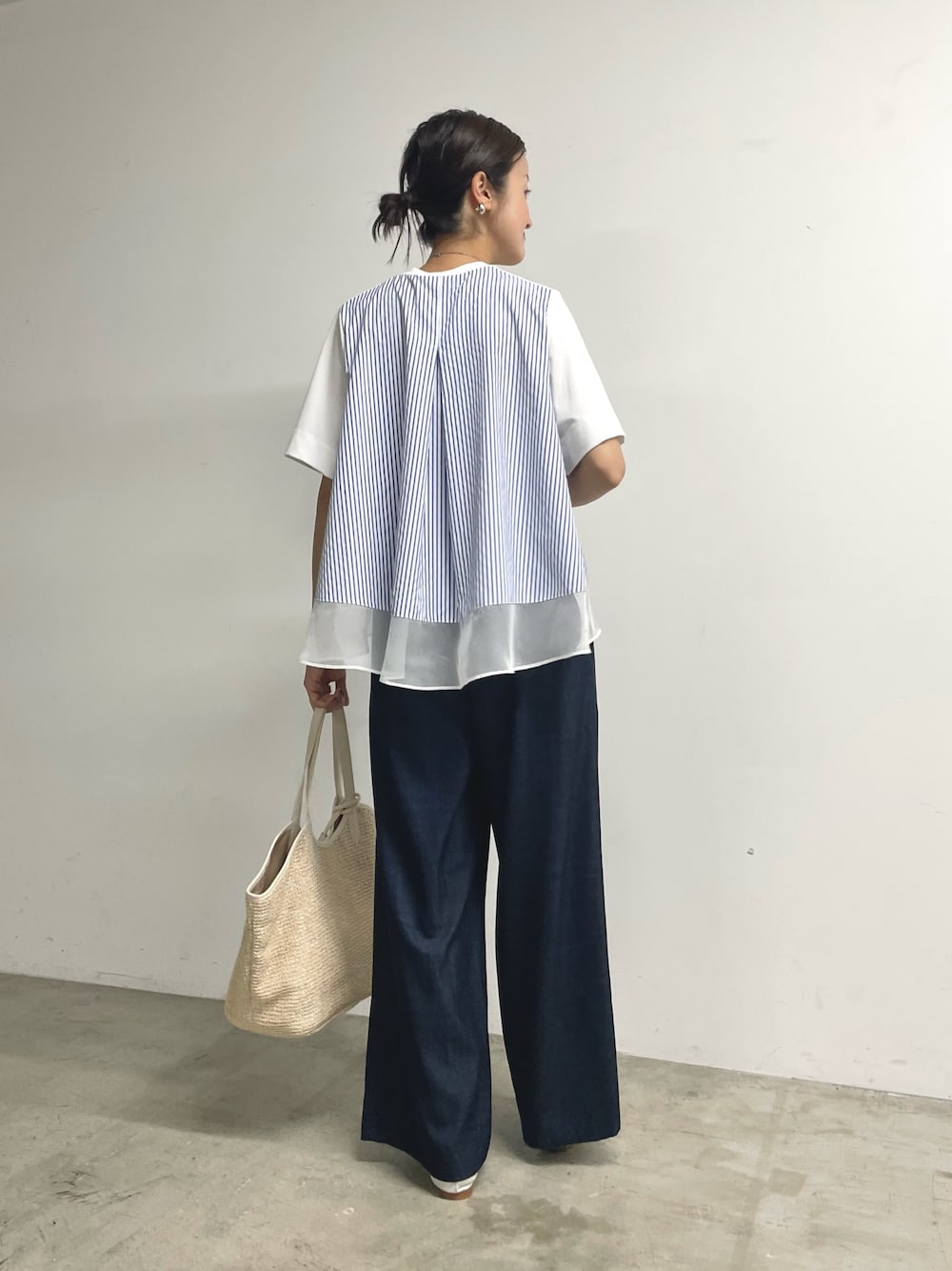 【カットソー】Fサイズ 五分袖ほどのTシャツにストライプとオーガンジー生地がコンビニなっています。 ほんのりフレアシルエットで動くたびにふわりと揺れる裾が軽やかで、体のラインも拾いにくいのが嬉しい。 背中にはタック入りで後ろ姿も抜かりない。 暑い日も重ね着せず、1枚で簡単おしゃれに着ていただけます。 166cmでも後ろはおしり隠れる長さで、前後差のある着丈。 ワイドパンツともバランスが取りやすいです。 手洗い可 【パンツ】TMサイズ着用 生地に落ち感があるので広がらず、ワイドパンツが苦手な方でも穿きやすいと人気のマルチウエストリブパンツ。 ウエスト総リブで楽ちん。 今回新しく、ウエストやヒップ、パンツ幅は1サイズと同じで着丈5cmほど長いTMサイズが登場します。 TMサイズはウエストジャストで穿けて、丈もちょうどくるぶしにかかる丈でヒールでも安心して穿けました! 手洗い可