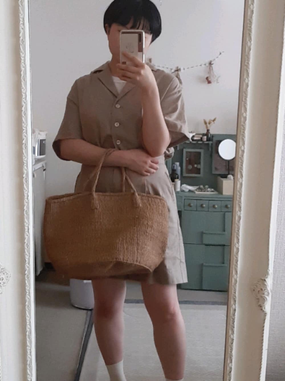 ベージュのつなぎとかごバッグ 楽チンなのに決まるのが好き。 ヤマモトリコちゃんのデザインした服、素晴らしい、大好き。