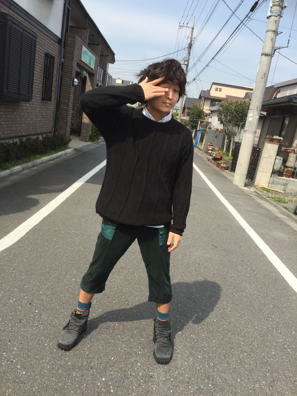 この上にマウンテンパーカー着てましたが、暖かいので脱ぎました。山っぽく、都会っぽく、お坊っちゃんぽく。