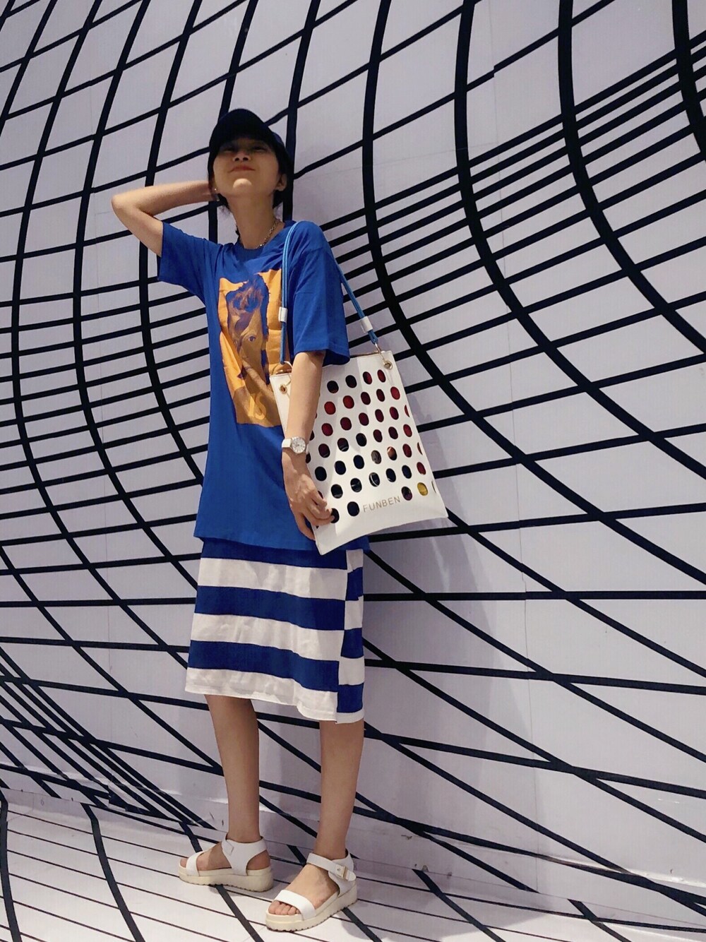Pull out my horizontal stripes sundress,wide short sleeves and baseball cap to become a laid-back girl~
