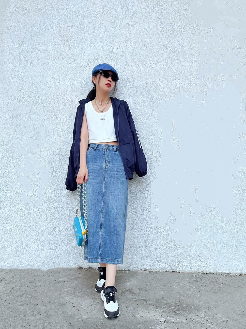 I wear a simple white top match the straight denim skirt to create the style fresh and clean~