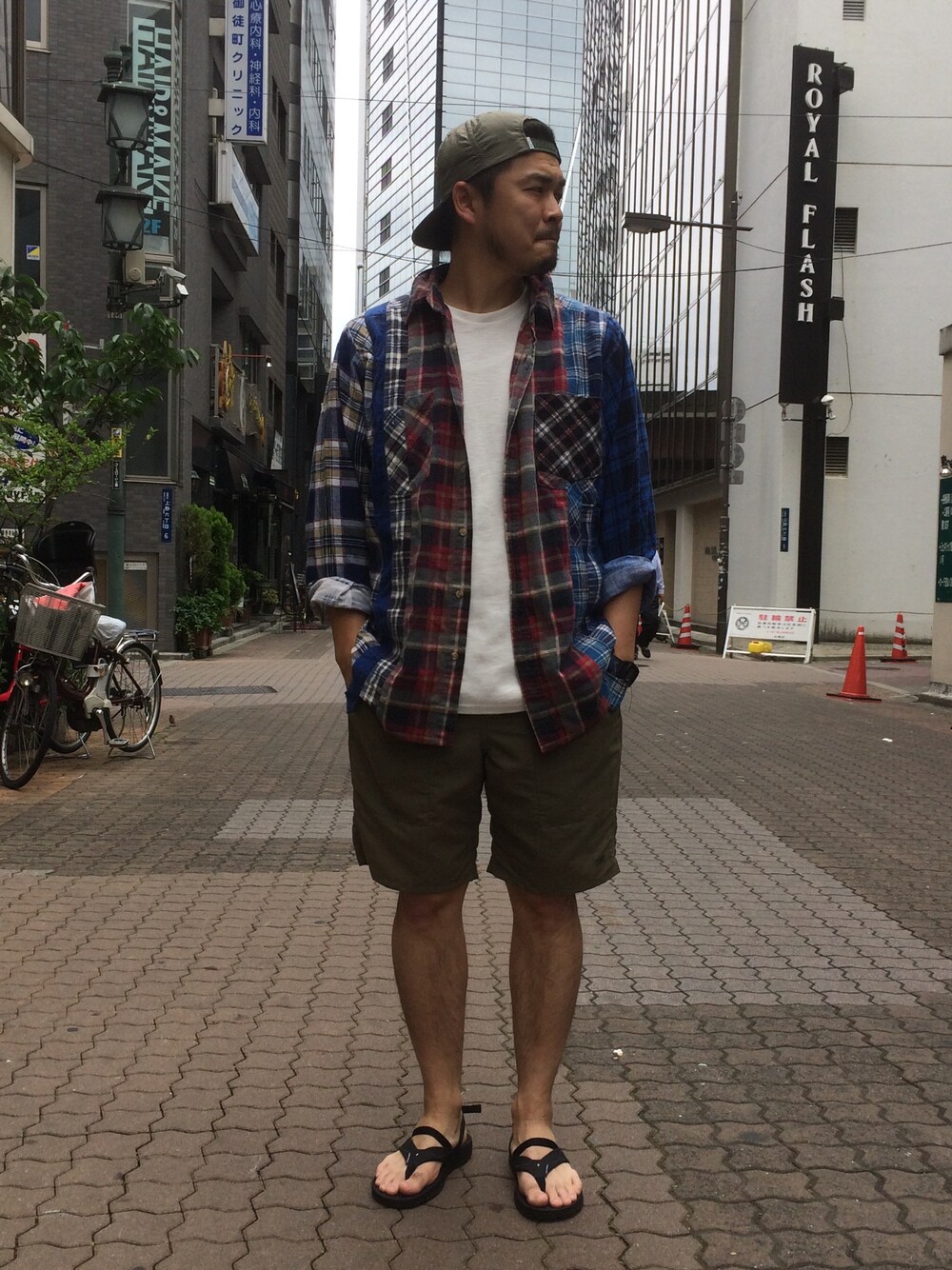 ちょっと肌寒い時は短パンビーサンネルシャツで。雨降ってもへっちゃらだい。
