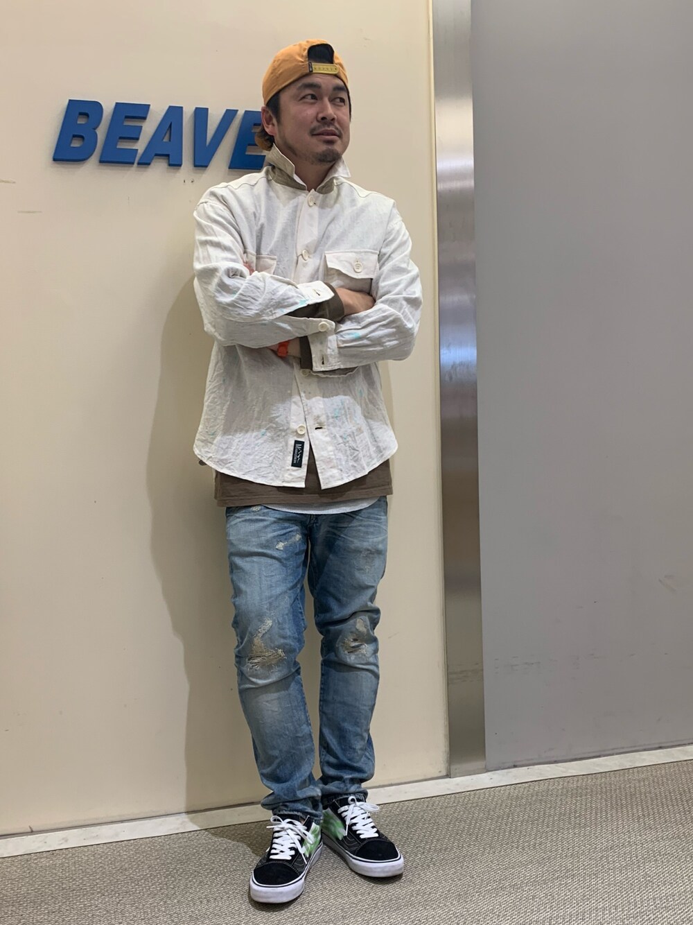 ダメージデニムに麻シャツ。 定番です。けど。懐かしい感じです。 足元はvansです。 ぜひお試し下さい。