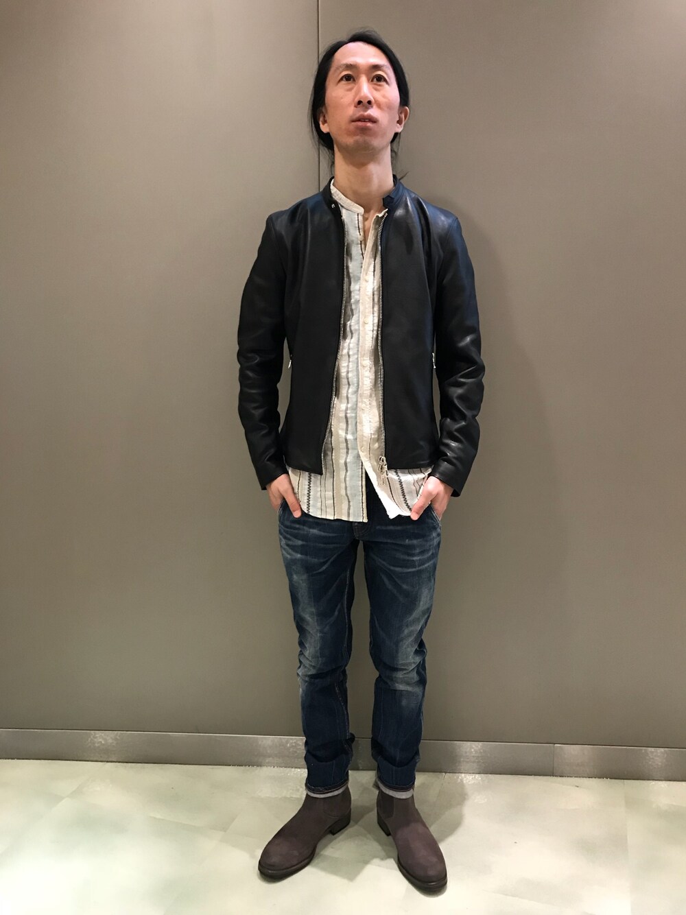 レザー 柄シャツ デニム ブーツ