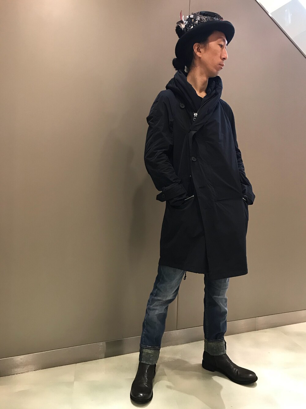 主役コートには、デニムとブーツが丁度いい。