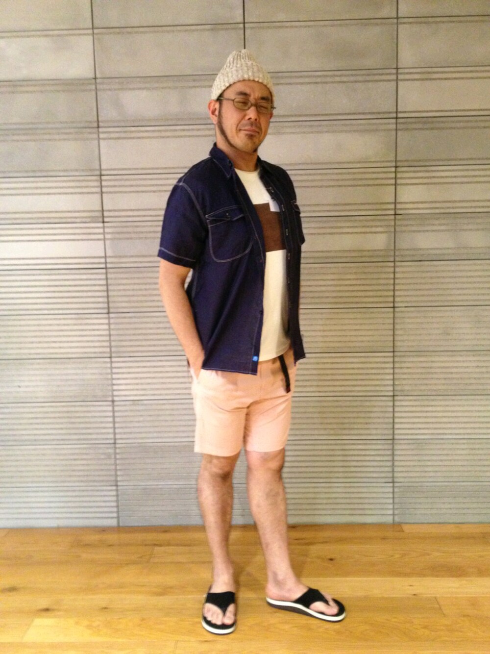 こんにちは! 今回は、大人のカラーショーツのコーディネート提案です! ピンクは抵抗ある方もいらっしゃると思いますが、トップスの色を抑えぎみにし、足元にサンダルを合わせる事によって、大人のサーフスタイルになりますよ(笑)