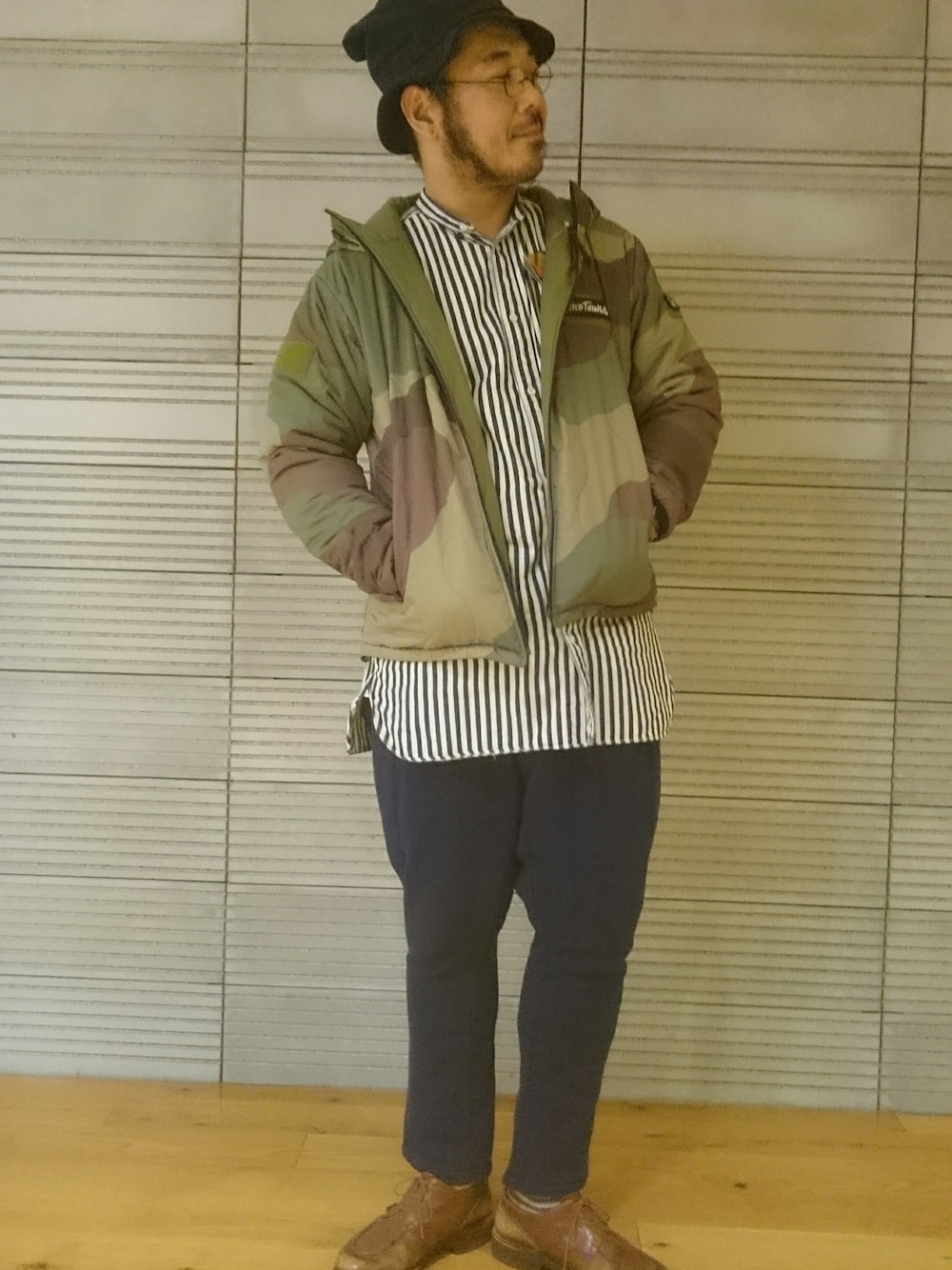 こんにちは! 今回は大人の迷彩スタイルのご提案です! ボトムスにリメイクパンツを合わせ、足元は革靴で締めています。 勿論、スニーカーでも大丈夫です♪