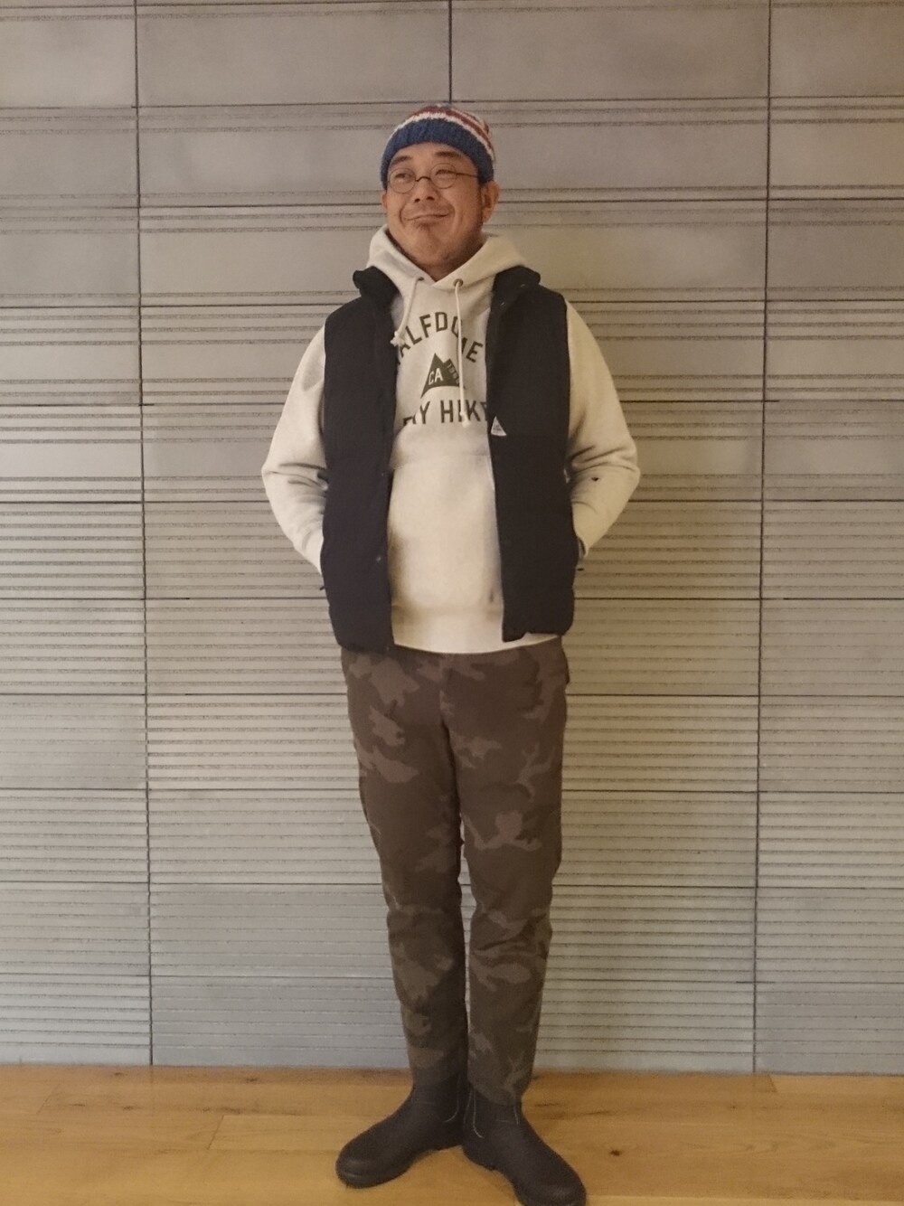 こんにちは! 今回は、今の時期に良いダウンベストスタイルのご提案です! 中にパーカーを着る事によって気温が低いタイミングでも活用できますよ♪