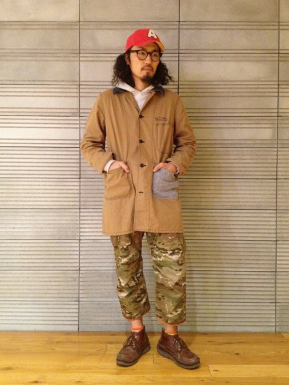 粕谷のステンカラーコート「MANASTASH(マナスタッシュ) HEMP SHOP COAT (617)」を使ったコーディネート