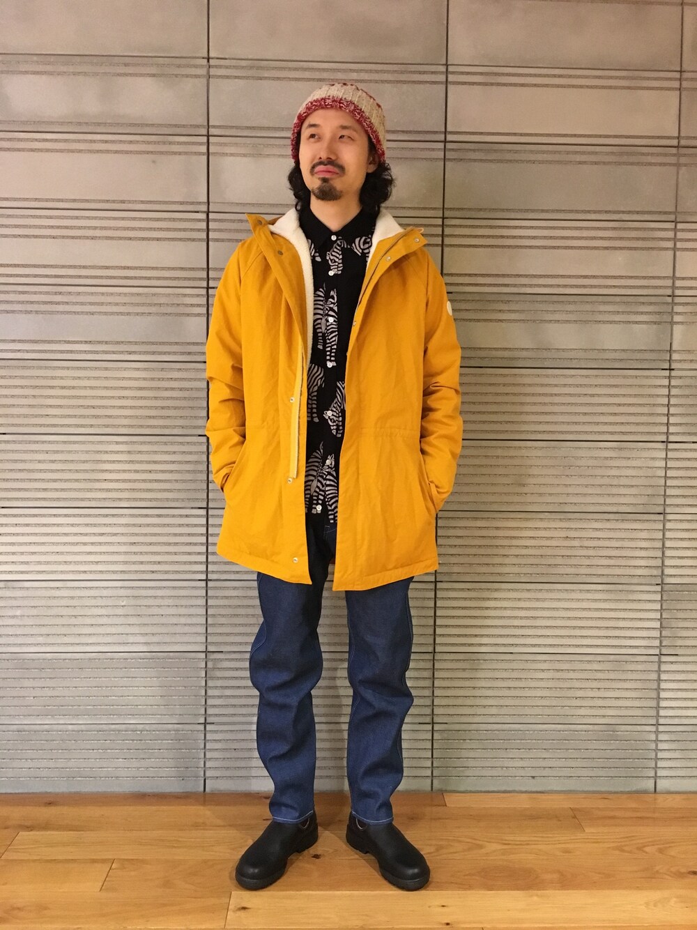 黄色いアウター気分あがりますね^ ^ プリマロフト入りで見た目よりかなりあったかです。