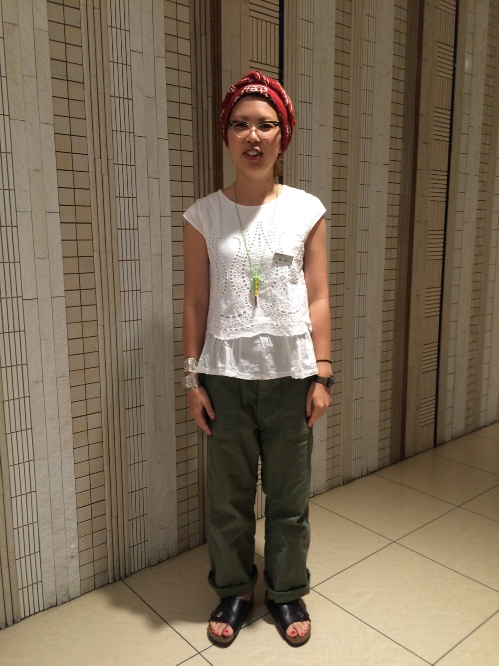 とうもろこしのネックレスがポイント。 このパンツお気に入りです。