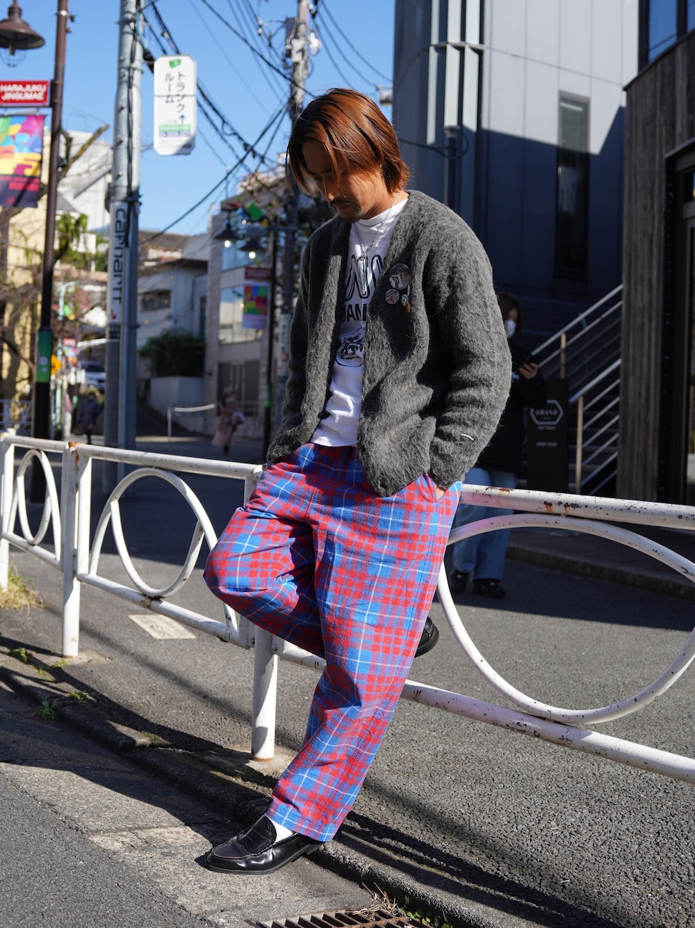 モヘアカーディガンを使ったリラックススタイル 毛足の長さがいい雰囲気出てます。 お好みで缶バッチ付けてアレンジしてもいい感じですよ。 緩めのネル素材のパンツもローファーで合わすとラフになり過ぎずオススメです。 カーディガンはSサイズ、パンツはMで履いてます。