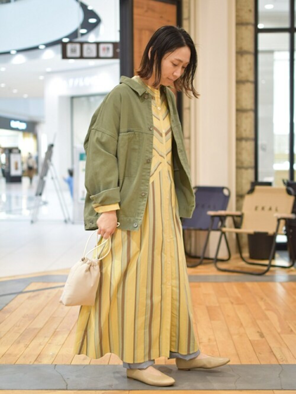 今回のスタイリング☻ ストライプAラインシャツワンピース入荷してきました! 3色展開でどの色もよくて。。 イエローをチョイス。 ストライプの入り方が特徴的。 低身長でも違和感なく着れます。 ワイドデニムをロールアップして合わせてます。