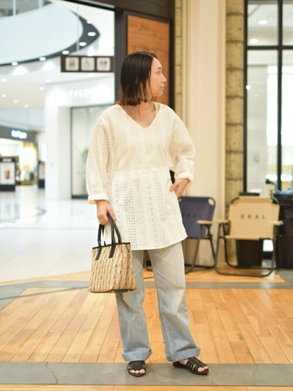 今回のスタイリング☻ アイレットレースブラウスを着用してみました。 すごく涼しげなブラウス。 タンクトップ合わせですがそこまで透け感は気にならないです。 身幅もゆったりしていて、胸元も苦しさはありません。 袖口はロールアップして抜け感出してます。