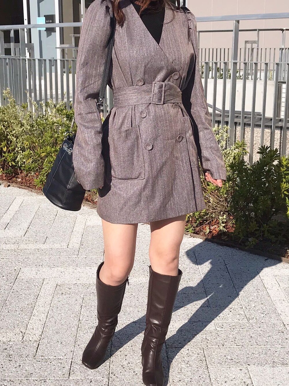 ミニ丈にはロングブーツ必須☺︎♡ インナーとバッグをブラックにしてメリハリのあるコーデに。
