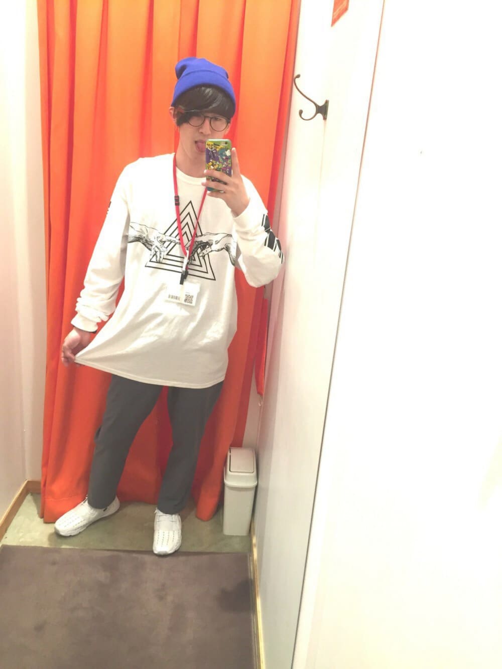 最近お気に入りのロンT。 パンツはキレイめにグレーのパンツを合わせましたー。 さし色に青ニット帽です!
