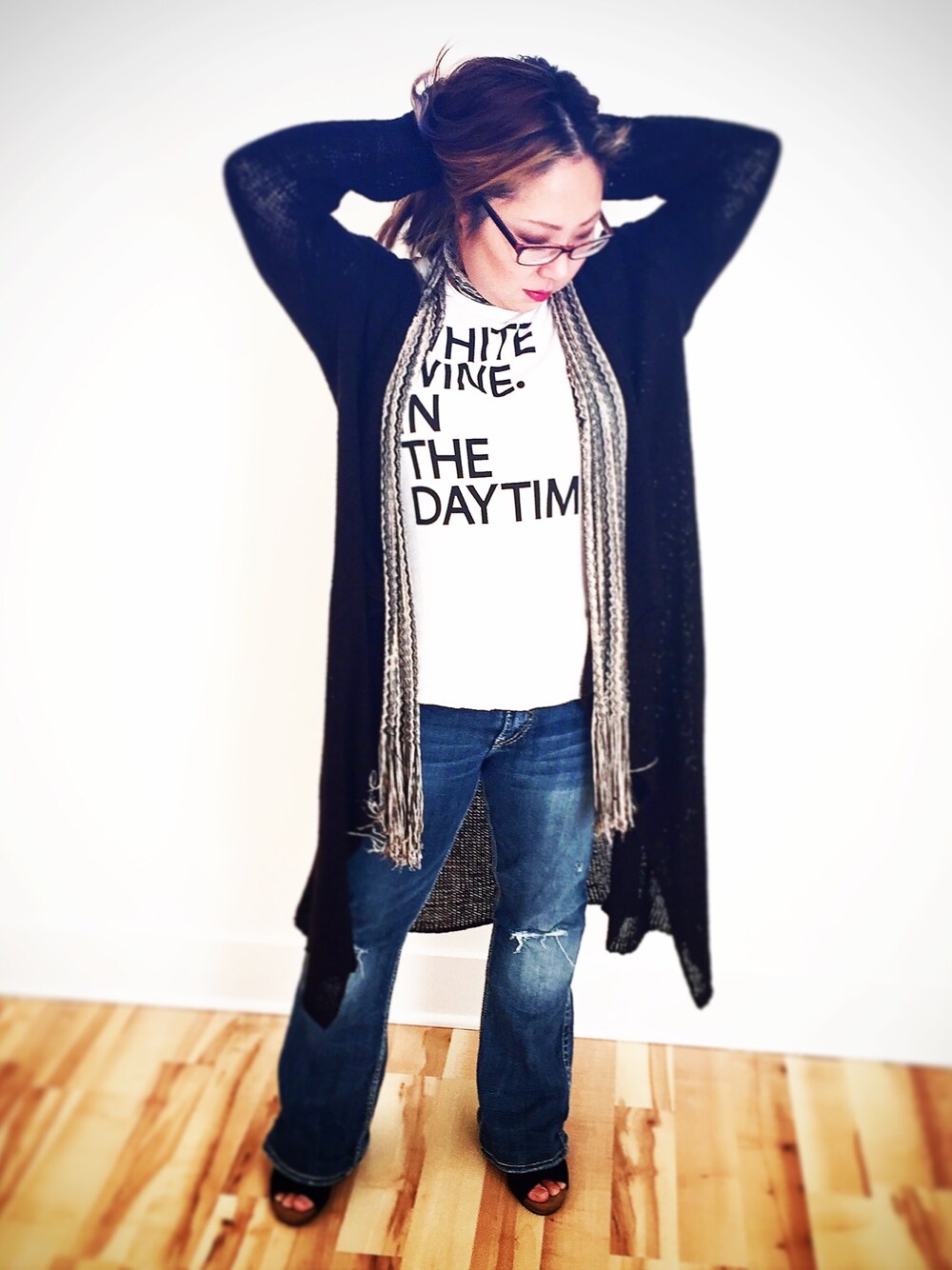 Add a skinny scarf, specs and comfy slides to bring your jeans and t-shirt look to another level.