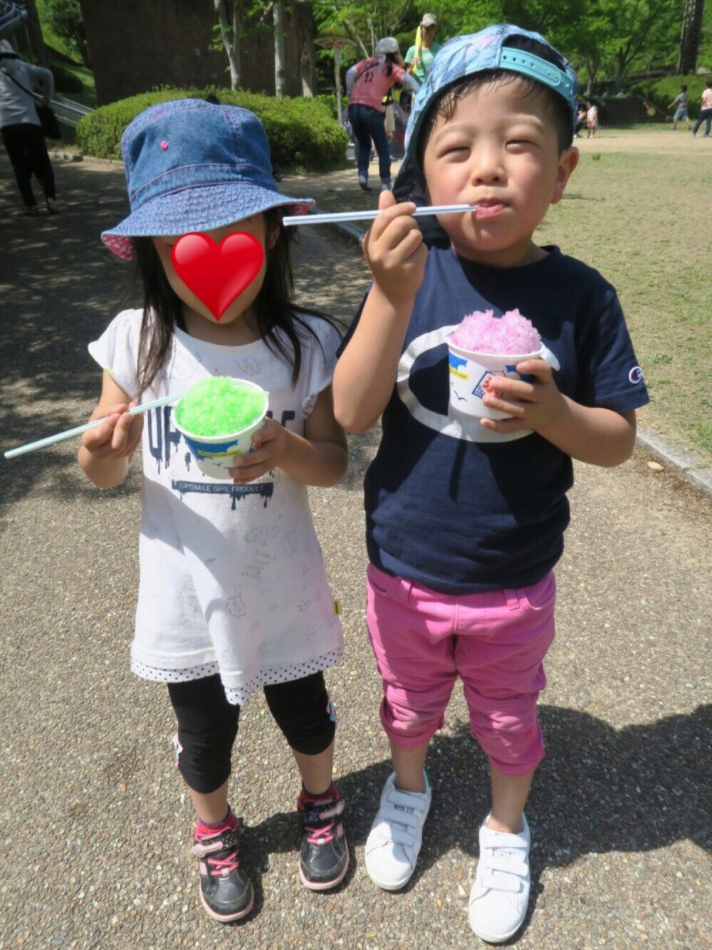 公園でかき氷デート中❤️ 色々アツアツ❤️の今日やけどかき氷でスッキリ〜 🎵 男の子が着るピンクが大好き❤️でよく着せてるなら、息子も好きな色聞いたら迷わずピンク!と答える😅