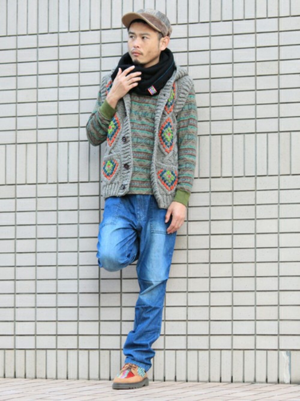 手編ニットをアウター替わりにミリタリーな雰囲気を演出。 デニムのウォッシュ加工でちょっぴりワイルドな表情に。