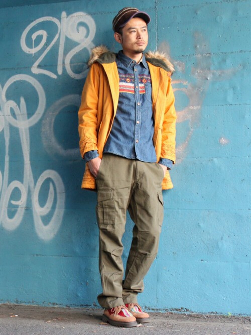 ミリタリーテイストのアイテムでまとめたカジュアルコーディネート。 存在感のあるイエローのモッズコートでインパクトを。