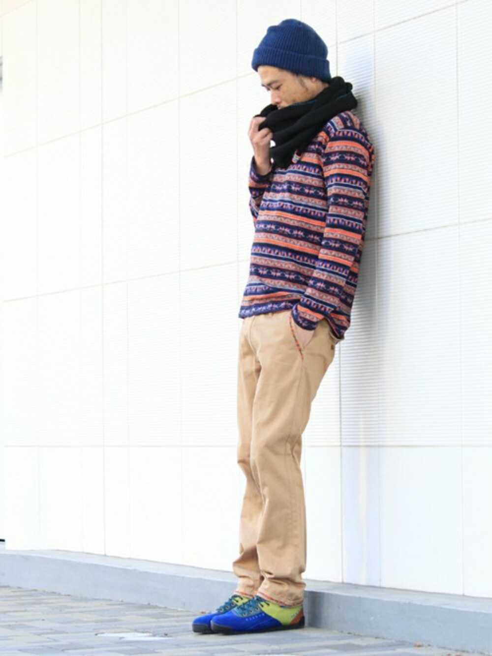 遊び心のあるエスニックな表情のボーダー柄Tシャツをメインにしたコーディネート。 帽子とスニーカーはブルーで合わせ、スヌードをくるっと巻いて。 小物をアクセントにしたスタイリングでまとめました。