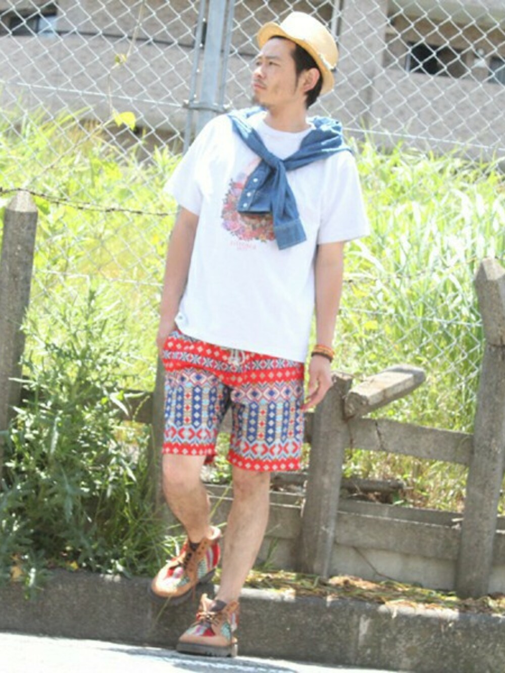 太陽の下で目立つ!ビビッドな柄パンツにTシャツを合わせたシンプルSTYLE。デニムシャツを羽織って、ちょっぴりワイルドな表情に。
