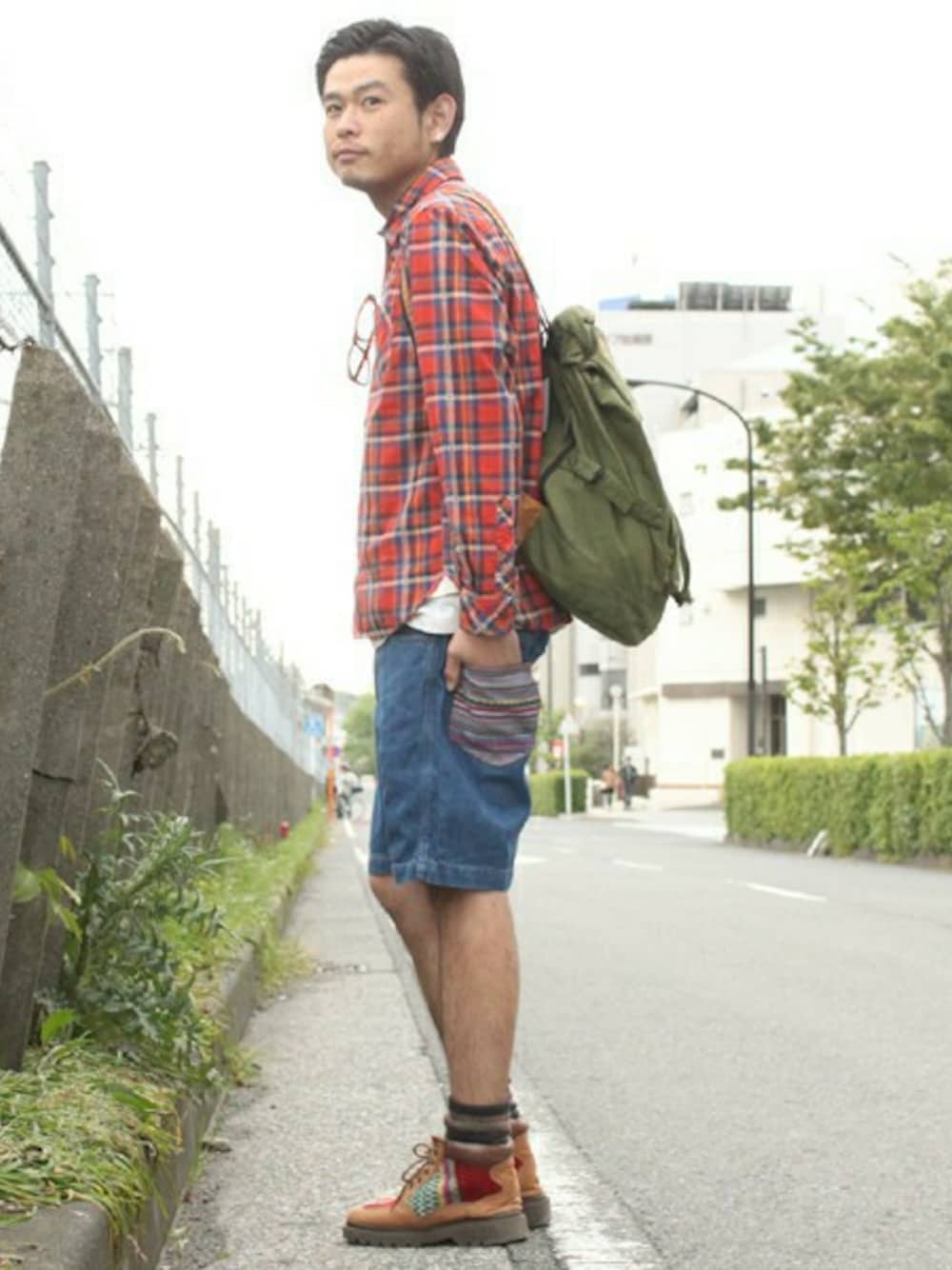 定番のチェック柄シャツもデニム地のハーフパンツに合わせて。デニムパンツのポケットはエスニック柄の生地になっていて、コーディネートのアクセントに。