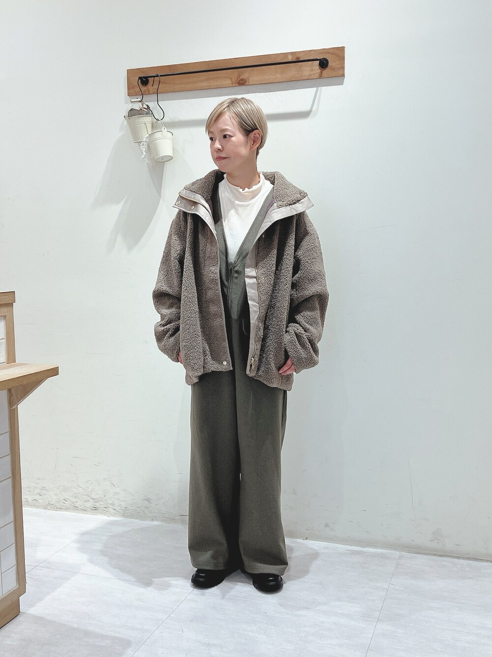 くぼでらのノーカラージャケット「スタンドカラーボアジャケット」を使ったコーディネート