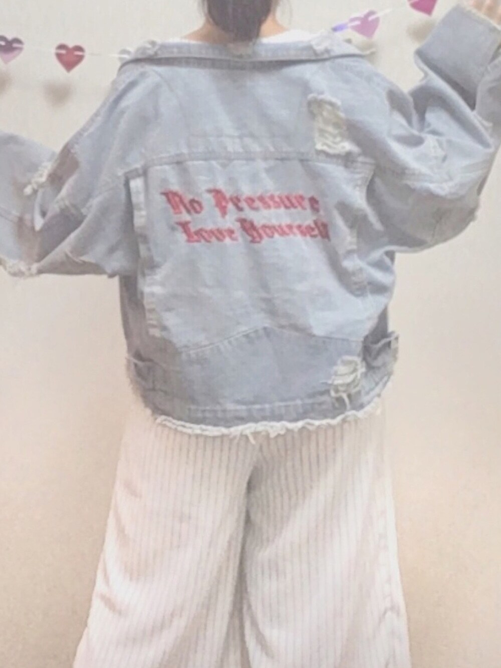 新しいアイテムのデニムジャケット🇺🇸 後ろはこんな感じになってます💁🏼♀️ ダメージも多く大きくて可愛い😈🖤 赤文字もイカつい感じになってしまうかと 思いきやそんなに主張は強くなかったです☺️❤️ デニムジャケットのオフショル 今はもう季節じゃないけど やり方がイマイチ分からないんだよなあ🌀 なんか上手く出来ないよ😣 分かる方良かったら教えて下さい🙇🏼♀️
