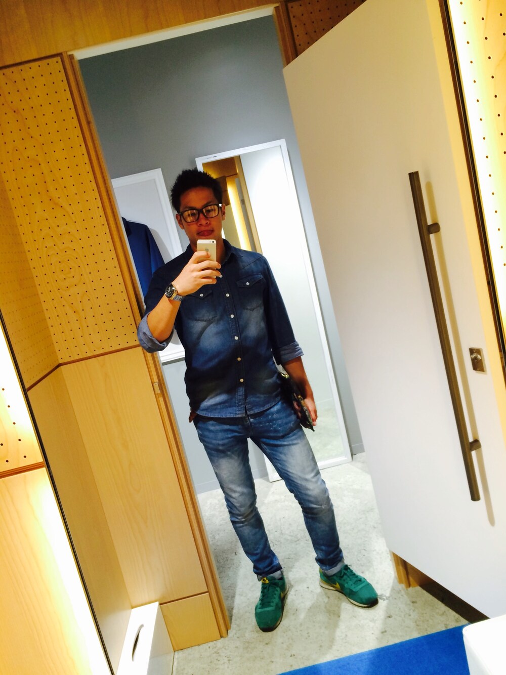 デニムオンデニムに初のダテメガネ😎 お気に入りの花柄のクラッチバッグ☺️
