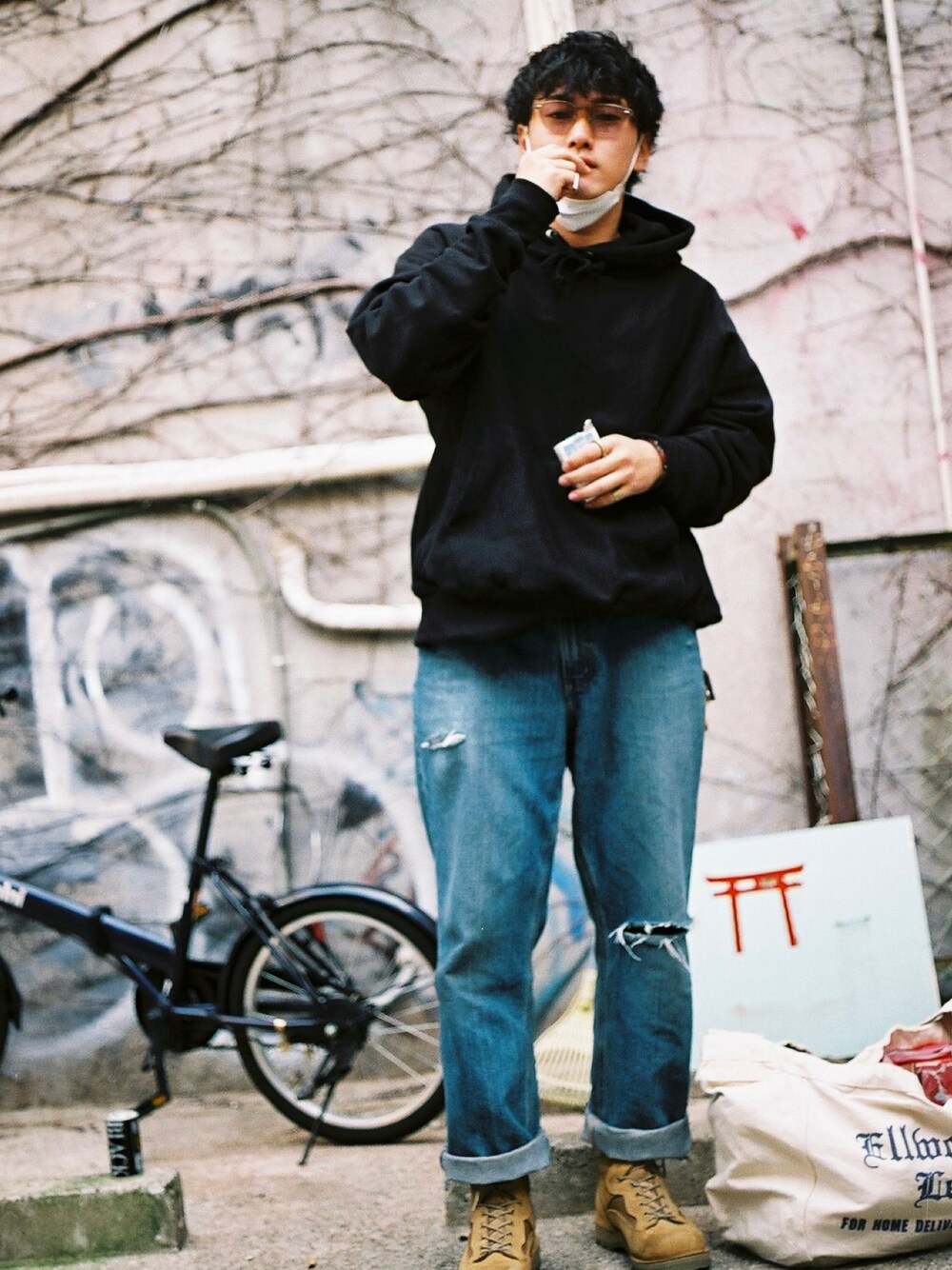 b.のデニムパンツを使ったコーディネート