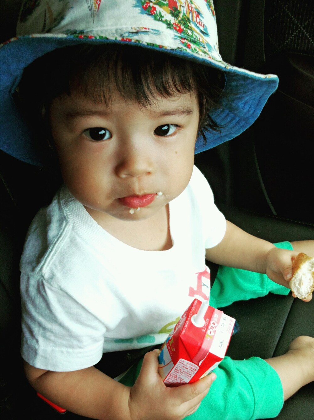 パパの用事に朝からおつき合い♡ 車内で朝ごはん♡ マミーとクリームパンをモグモグモグ(●^o^●)