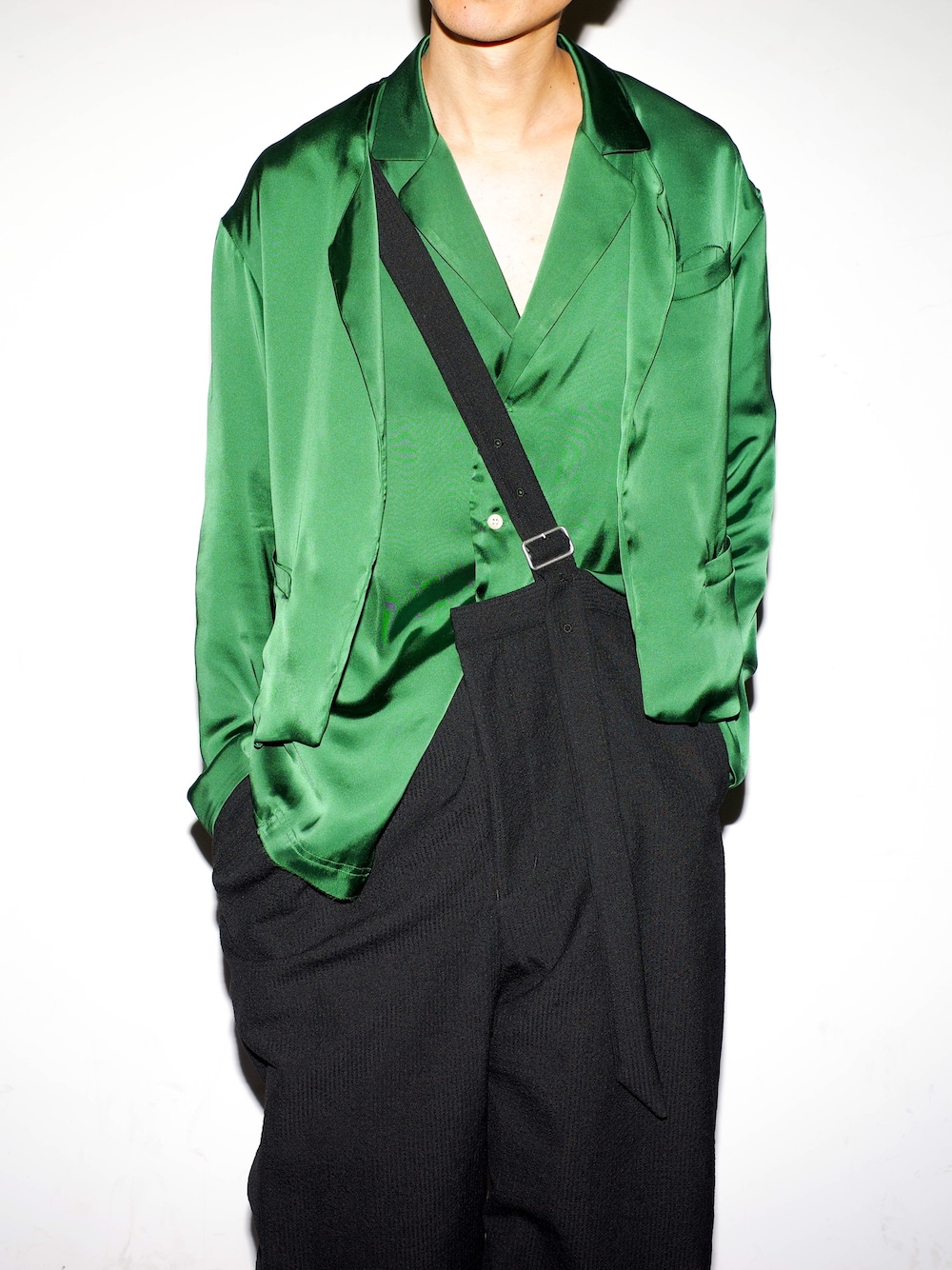 かなりどデカいショルダーパンツに 光沢感のあるグリーンのシャツ✖︎ジャケットを合わせました。 モードなアイテムと抜け感のあるショルダーパンツが かなり相性良いです🍭✨
