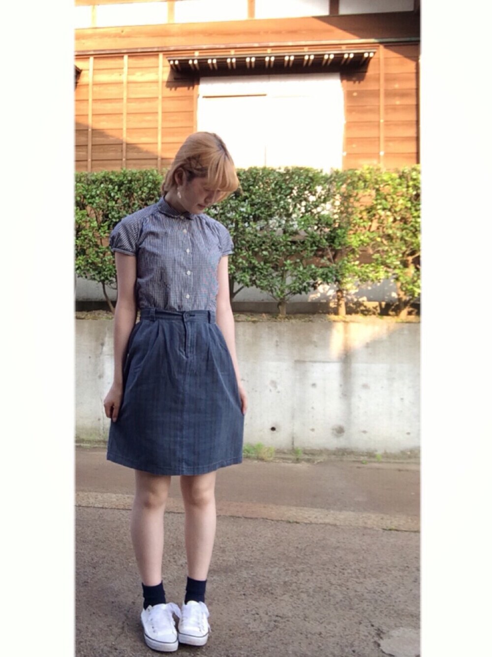 靴下ピンクか赤で迷って結局ネイビー。 遊べない真面目ちゃん\( Ö )/ スカートはストライプで柄×柄コーデでした✦
