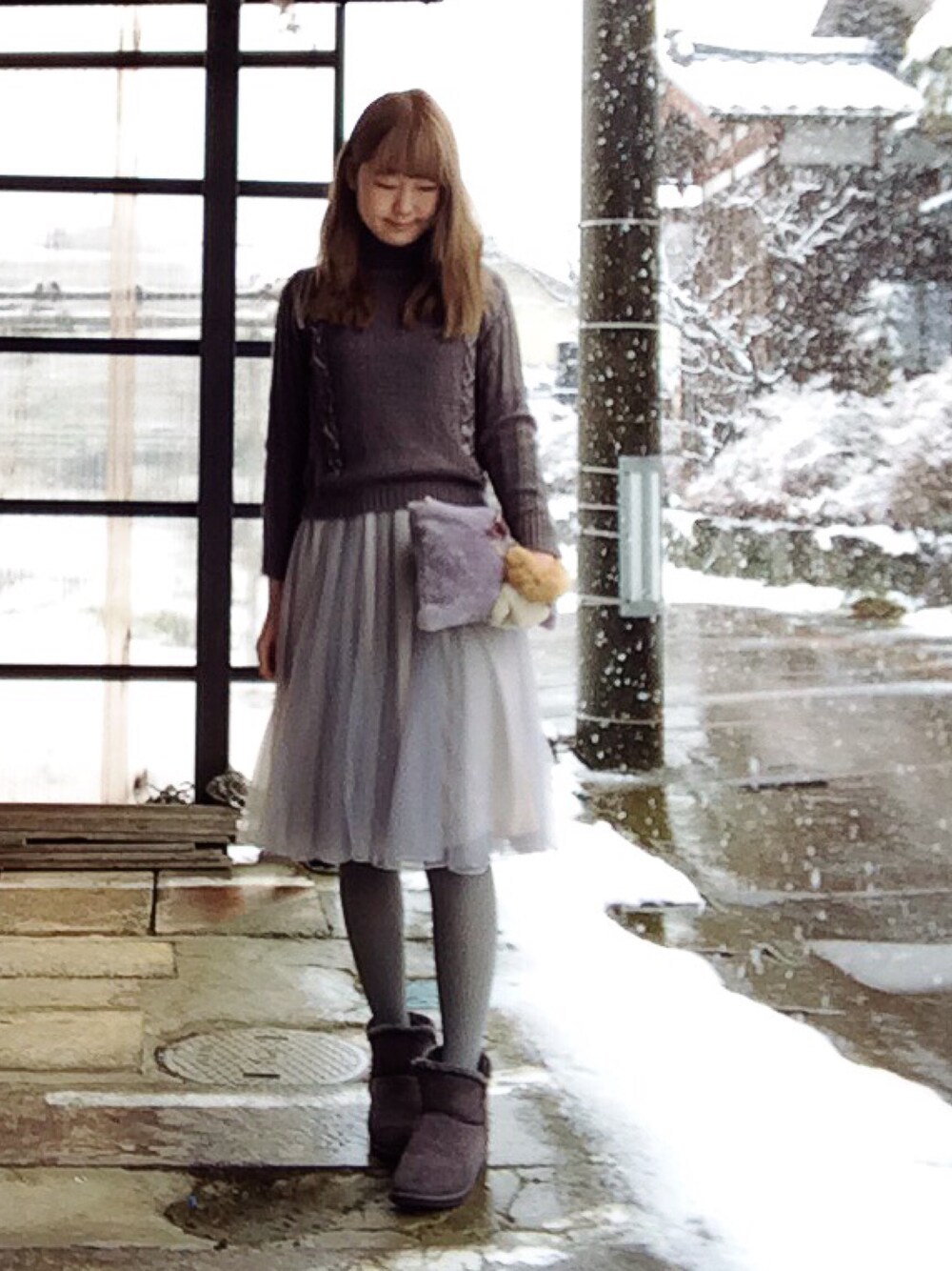 背景で田舎加減がバレちゃう\(°∀° )/ 雪きらい☃!でも木に積もる感じはめちゃ綺麗なんだよね~✧ コーデはグレートーン。 今期はグレーばっか見ちゃう。 そして安さに負けて買いそうになるけど安いのばっか着てると安ぽっくなちゃうよね(><)プチプラ大好きだけど程々にしないとな、、