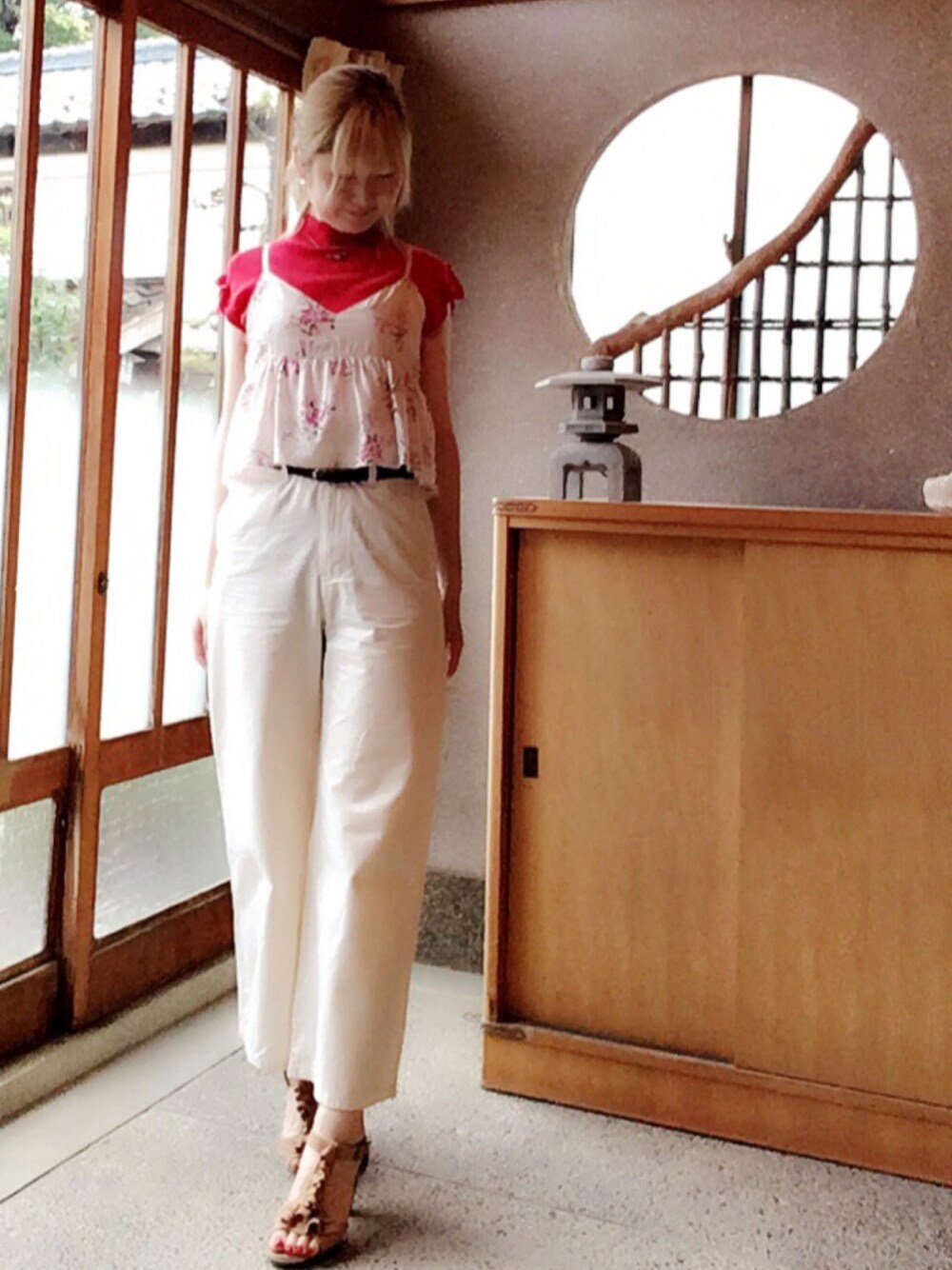 背景が変わりました~ 花柄キャミは年配の方にウケがいい☺️ 赤ニットに重ねてみた💓 ほんとはグレーのミニスカだったけど 寒むそうだったので白のワイドパンツに🔃