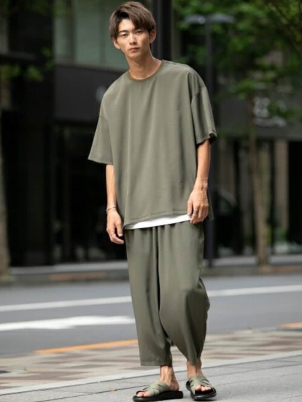 En serio TOKYO officialのTシャツ/カットソー「ソフトジョーゼット レイヤード Tシャツ × ラウンジパンツ ビッグシルエット リラックス 3ピースセットアップ」を使ったコーディネート