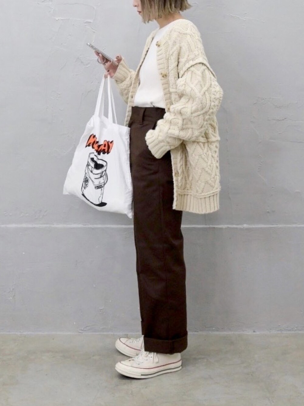 RICOのニット/セーター「パッチワークケーブルマルチウェイカーディガン(パッチワークニット/パッチワークプルオーバー)」を使ったコーディネート