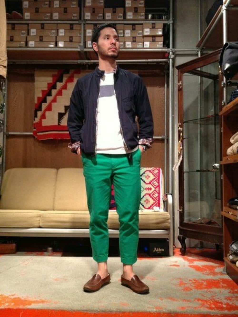 ネイビーと発色のいいグリーンを合わせ、上品ながらもショートブルゾンと8分丈のスラックス、モカシンで大人カジュアルを意識しました。