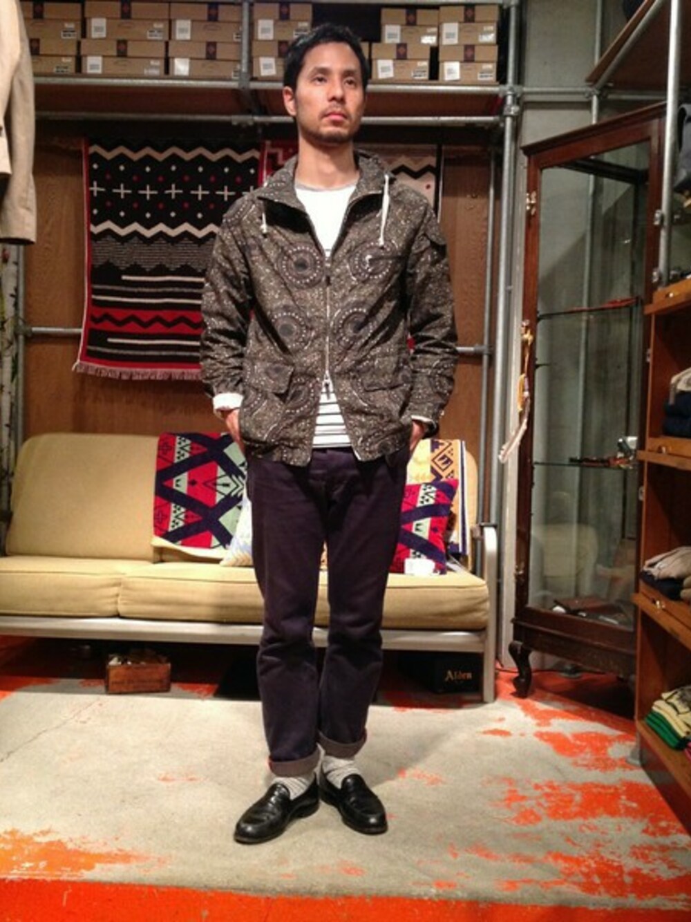 今シーズン一押しのダークバティックプリントのパーカーをホワイト×ネイビーとコーディネート。 足元はローファーを合わせて、アイビー的なスタイルに。