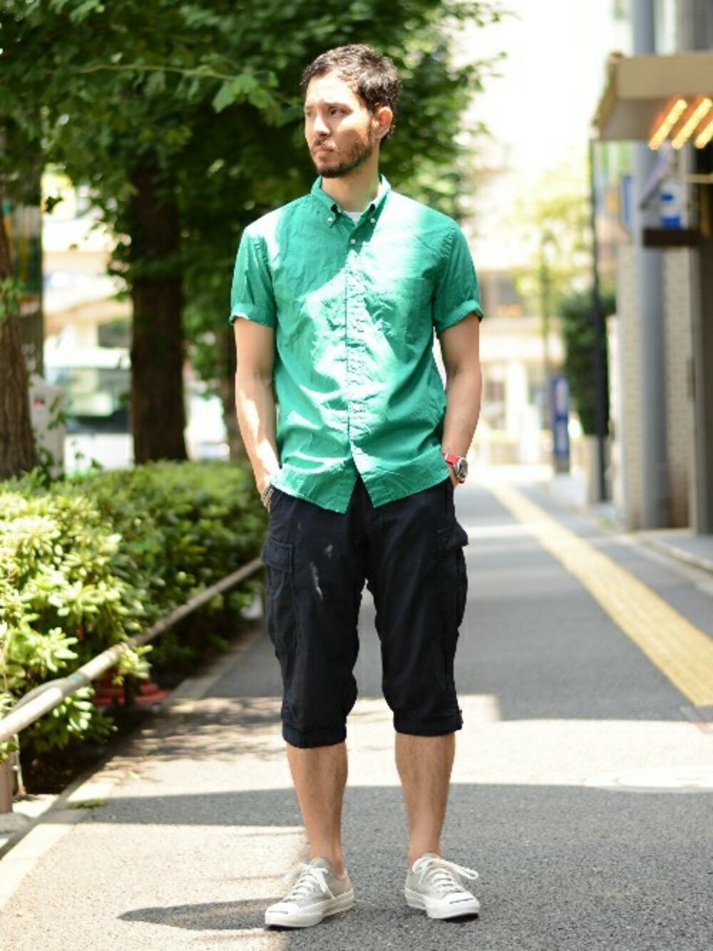 ヴィヴィッドなカラーリングのアイテムでも積極的に取り入れる。ボトムのカラーは落ち着かせてシャツが引き立つバランスのとれたコーディネイト。
