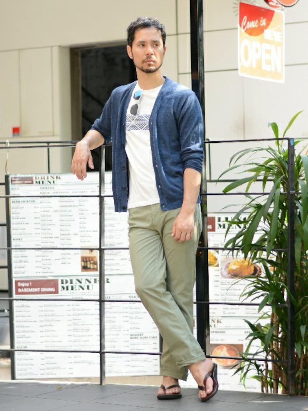 さらっと羽織れるリネンカーディガンをさらっと羽織ったお手本スタイル。肌寒い時に、軽装しがちな時に重宝する一枚!と思わせる。まさにそんなコーディネイトです。
