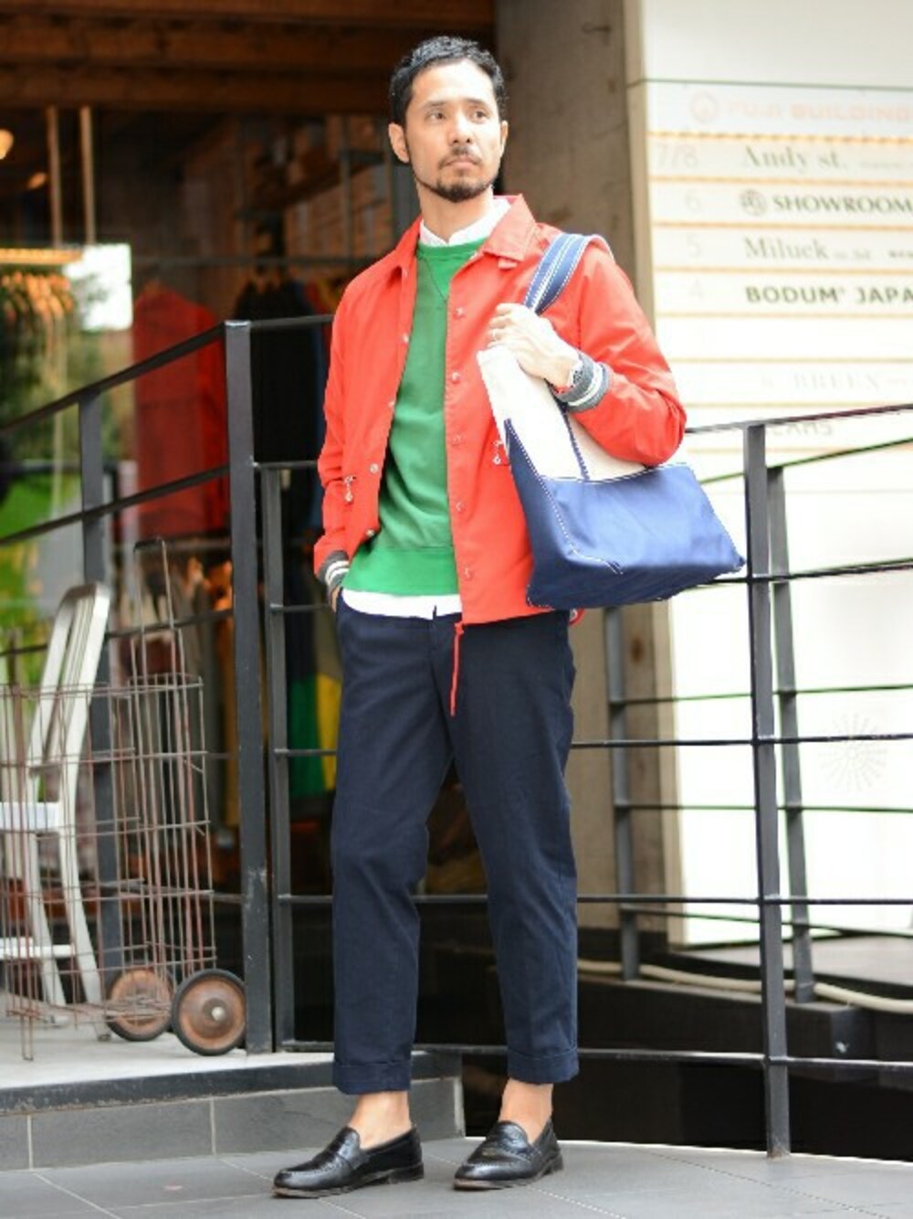 カラフルなトップスを上手く組み合わせた上級コーディネイト。BEAMS PLUS別注のLL.Beanトートバッグはどんなスタイルにもはまります。HasebeがもつのはMサイズのタイプです。