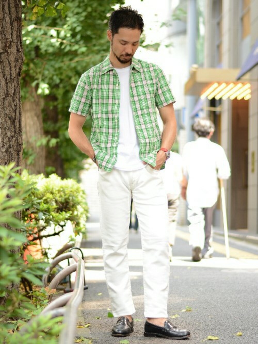 シャツの色味を活かし、清涼感のあるコーディネイト。リゾート感すら漂うなかにブラックのローファーで全体を引き締めたあたりはHasebeのお得意パターン。旅行にもデートにも行ける夏大人スタイルです。