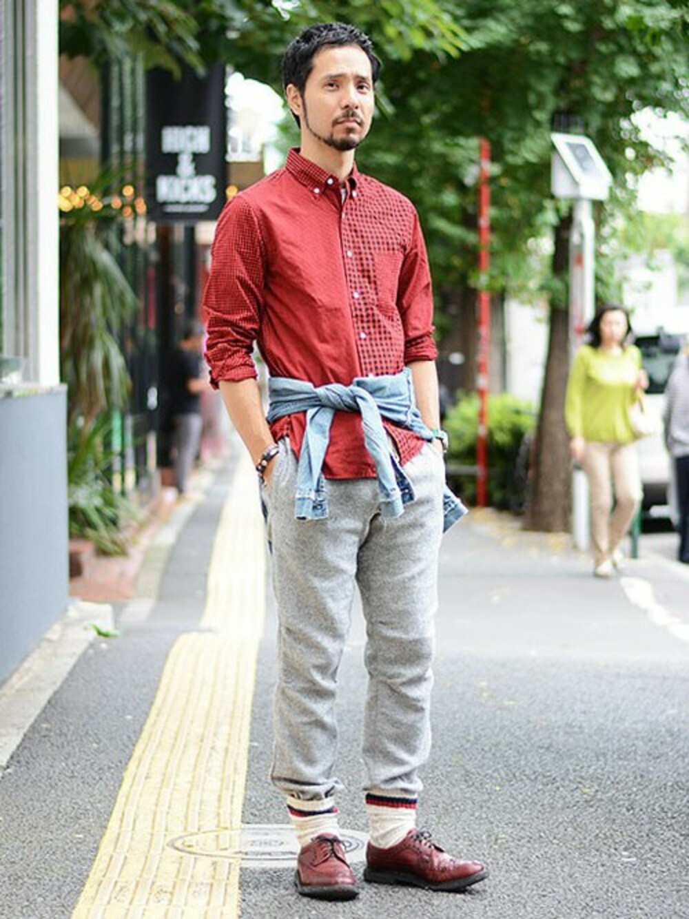 表情豊かなシャツが主役なので、ボトムスはスッキリ&シンプルに。デニムジャケットを腰に巻いてスタイリングに味付けをしてみました。